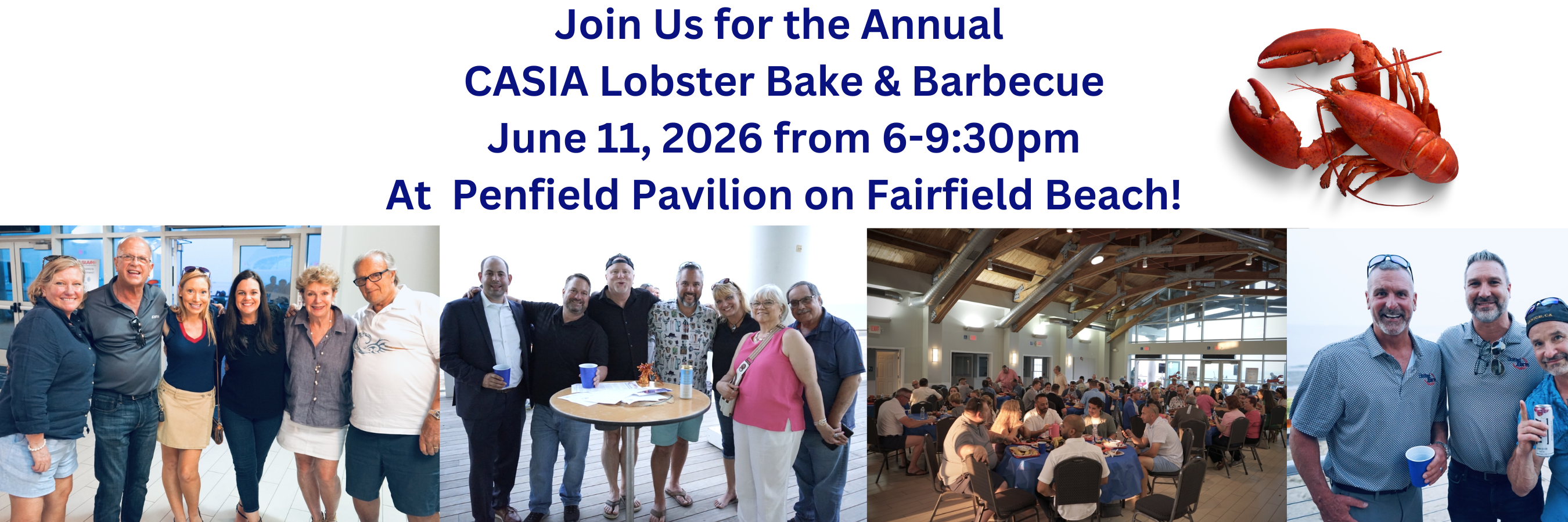 REGISTER HERE!!! The 2026 CASIA Lobster Bake will be held on Thursday, June 11th back at Penfield Pavilion on Fairfield Beach!! Meal Choices this year include Lobster, Baby Back Ribs or Barbeque Chicken!!!